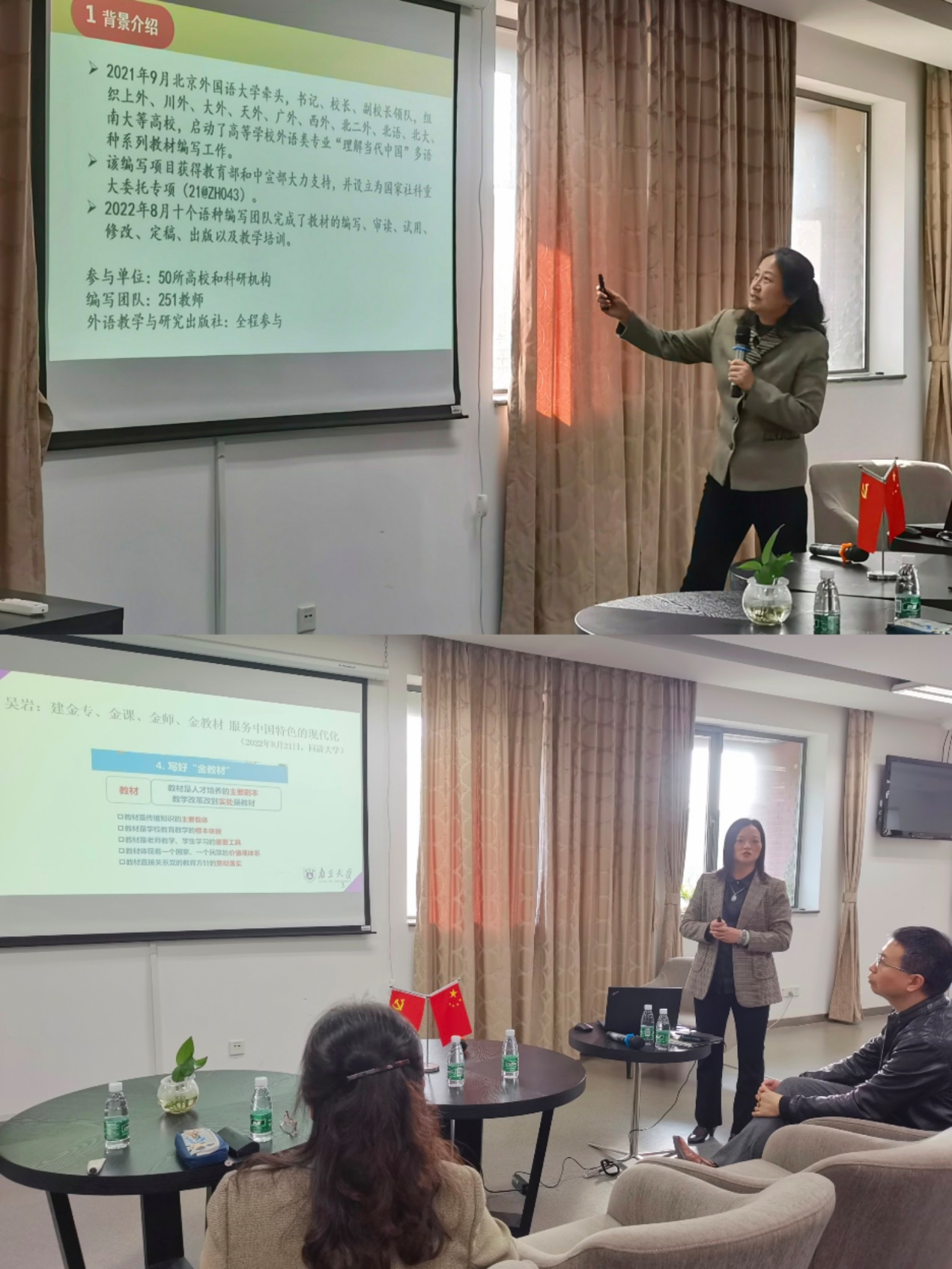 高等学校"理解当代中国"德语系列教材总主编孔德明教授和《理解当代中国:汉法翻译教程》主编刘云虹教授分别作了"用好‘理解当代中国’教材、用德语讲好中国故事"和"关于‘理解当代中国’系列翻译教材使用的几点思考——以《理解当代中国:汉法翻译教程》为例"主题发言。孔德明介绍了德语系列教材编纂的背景与意义、教材宗旨与结构,从如何使用教材讲好中国故事、如何通过虚拟教研室助力教学等角度进行了分享。她希望教师以融入课程思政、培养综合能力、融合内容语言、贯彻先进理念为教学原则,帮助学生领会习近平治国理政思想,理解当代中国的发展与成就,提高向国际社会讲好中国故事的能力,推动中国更好走向世界,世界更好了解中国。刘云虹从相关教材的使用原则、课堂教学的具体方法等角度发言。她希望教师不断提高理论素养,以价值为指引,构建分析式教学、探究式教学和互动式教学模式,有机融通课程思政教学与翻译教学,帮助学生在提高翻译能力的同时,领会掌握习近平新时代中国特色社会主义思想的根本内涵与科学体系,引导学生将习近平新时代中国特色社会主义思想内化于心、外化于言。