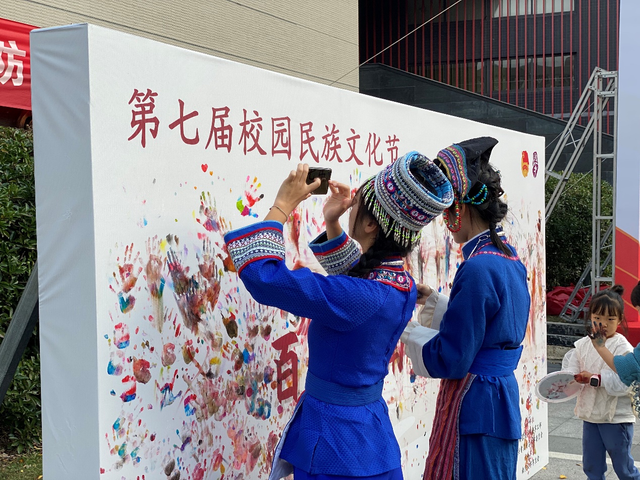 特色舞台旁的空白展板上,各民族同学们共同创作了一副五颜六色的手印画,代表着各族人民手牵手、心连心,建设美丽祖国的共同愿景。