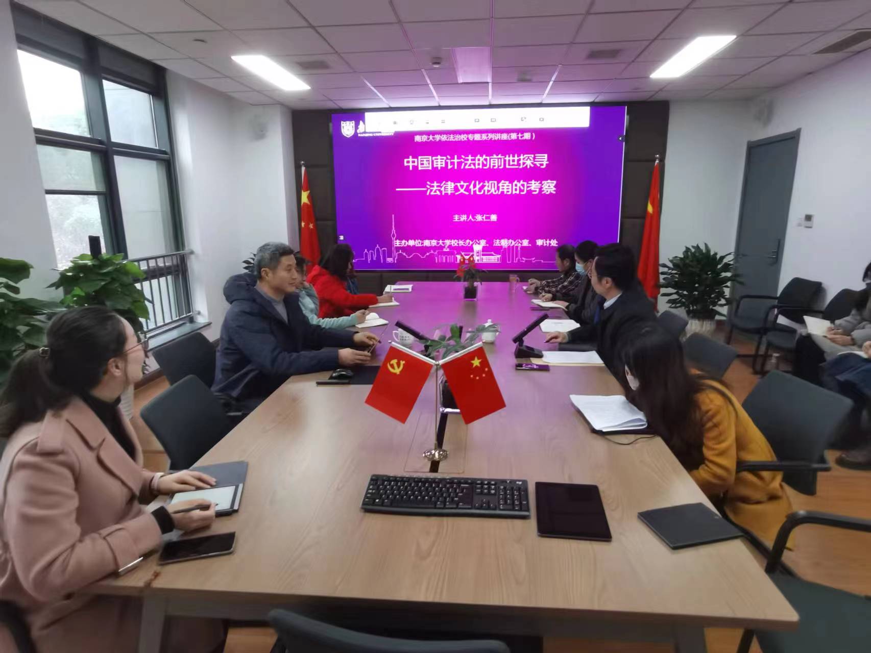 11月30日下午,由校长办公室、法制办公室、审计处联合举办的凯发k8官网依法治校专题系列讲座(第七期)在仙林校区行政北楼召开,凯发k8官网法学院张仁善教授作题为"中国审计法的前世探寻"专题报告。校长办公室、法制办公室、中美中心等单位有关同志和审计处全体工作人员现场听取了报告并作了充分的交流,活动由审计处处长骆威主持。
