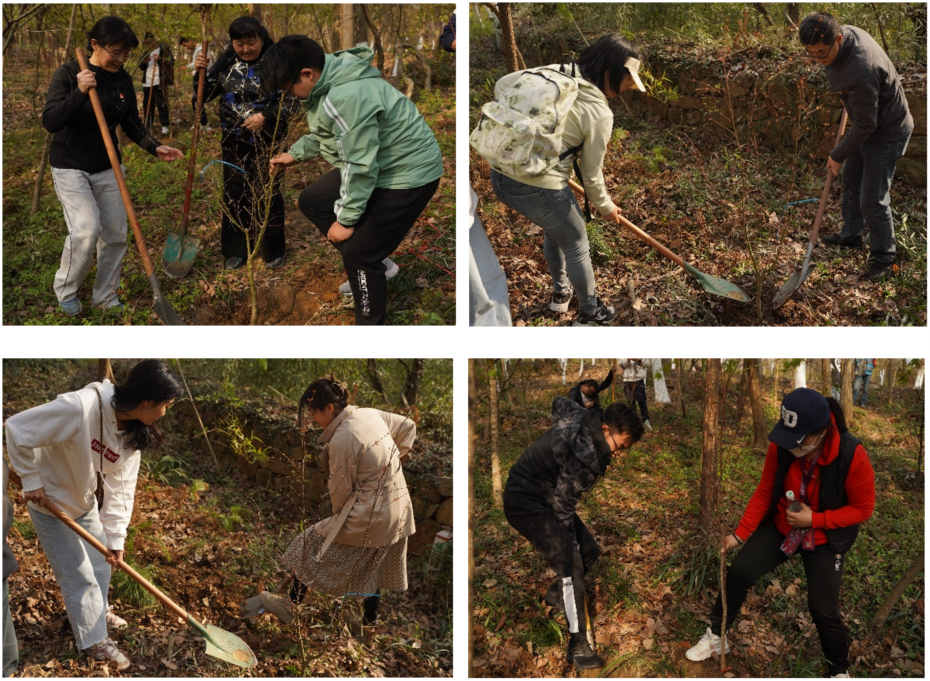 在植树活动中,全体党员干部热情饱满、分工协作、相互配合,大家一起挥锹铲土、扶正苗木,每个环节都衔接的井井有条。通过大家的努力,一排排新植的树苗昂然挺立在山头,在和煦的微风中萌发盎然生机,为栖霞山又添一抹绿意与活力。