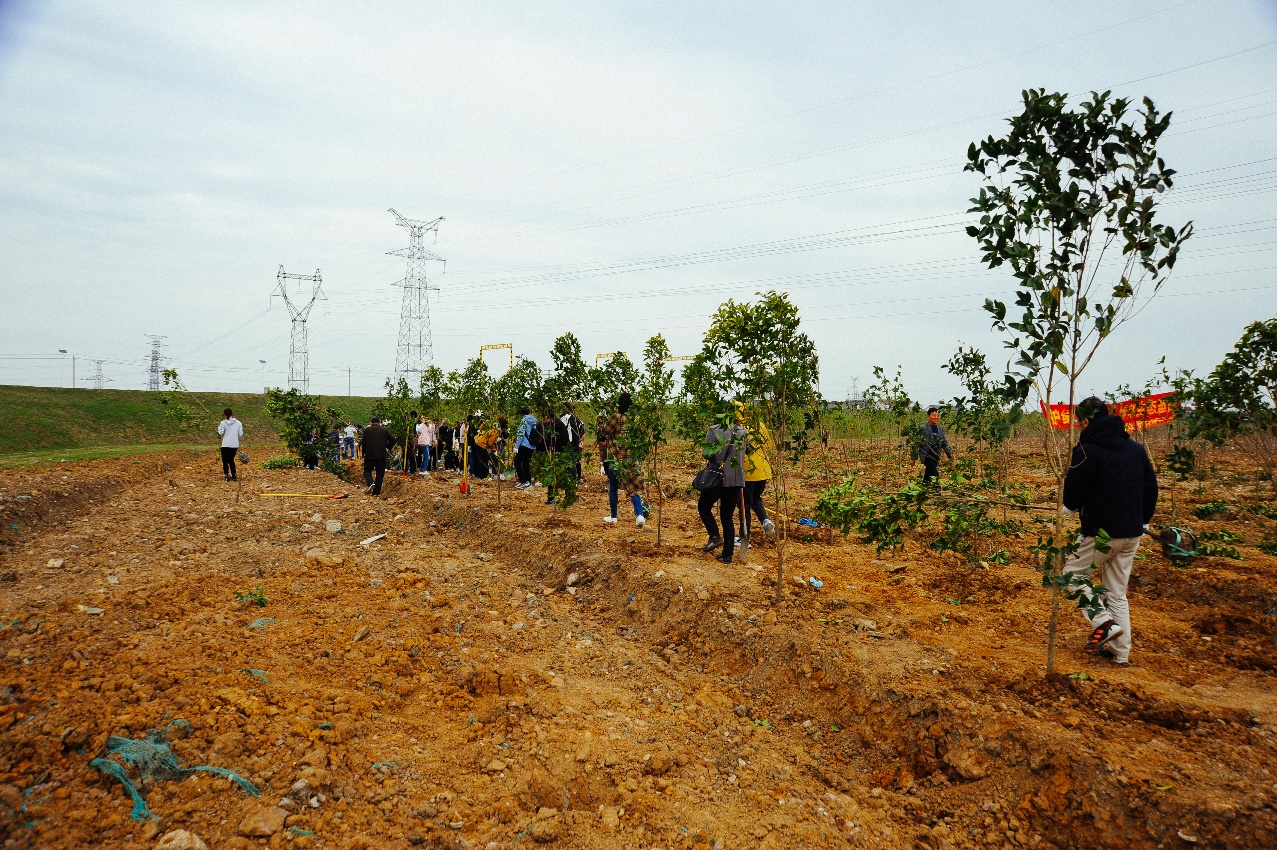 在植树活动中,师生们相互配合,分工协作,一起挥锹挖坑、扶苗栽种、培土压实、浇水灌溉,在热火朝天的氛围里延展出一片绿色生机。经过辛勤劳动,师生们共同种下的两行青绿在田野上迎风而立,展现出蓬勃的活力。