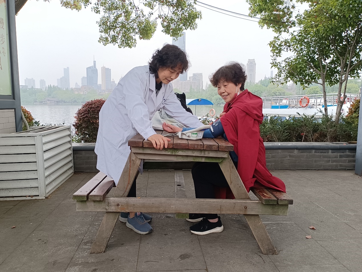 当天,校医院派出的杨晓明医生带着急救设备来到环湖走活动现场,为老同志们的健康保驾护航。