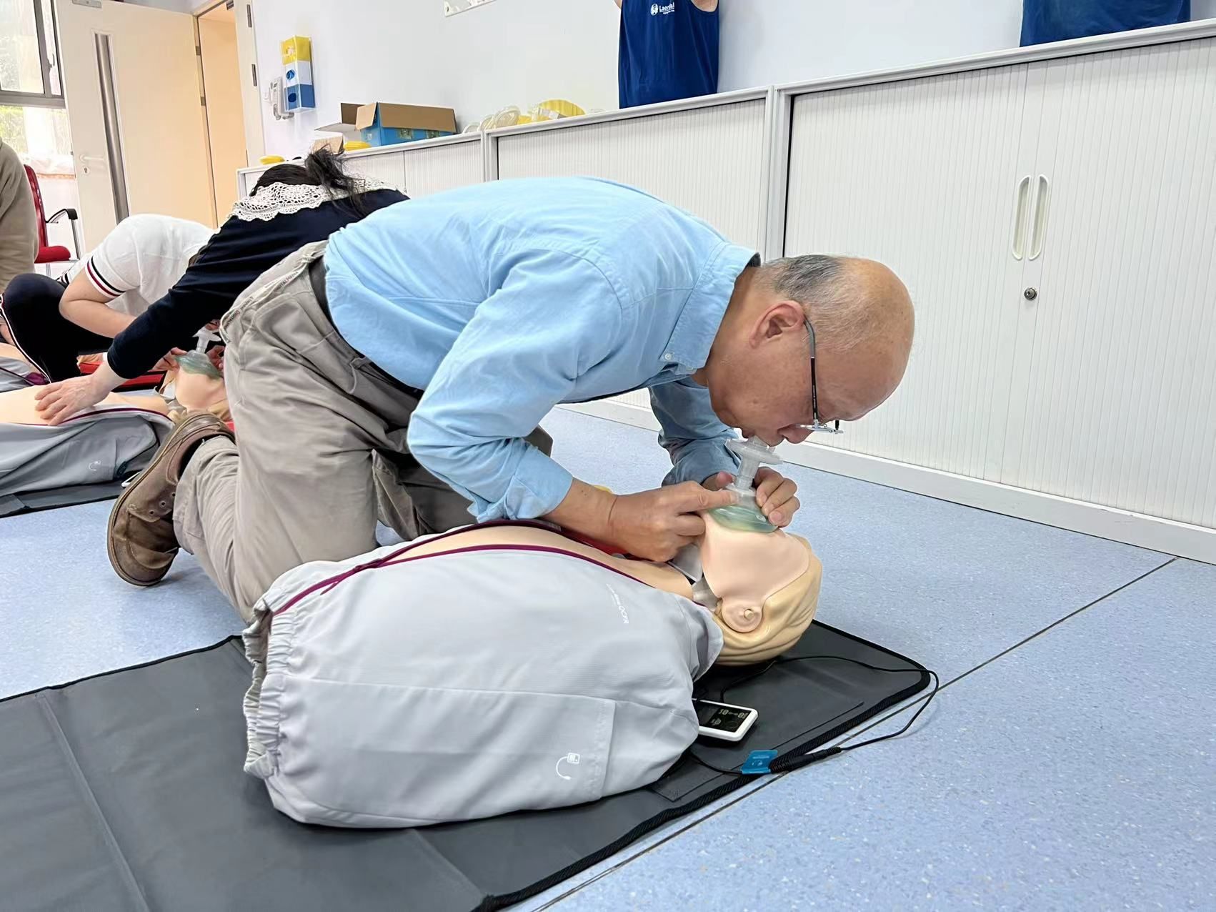 通过反复实操、耐心指导,中心师生掌握了AED设备的使用方法和操作细节。最后,肖瑞和徐国梅两位老师还为大家科普了生活中常见的急救知识和技能如海姆立克急救法等。