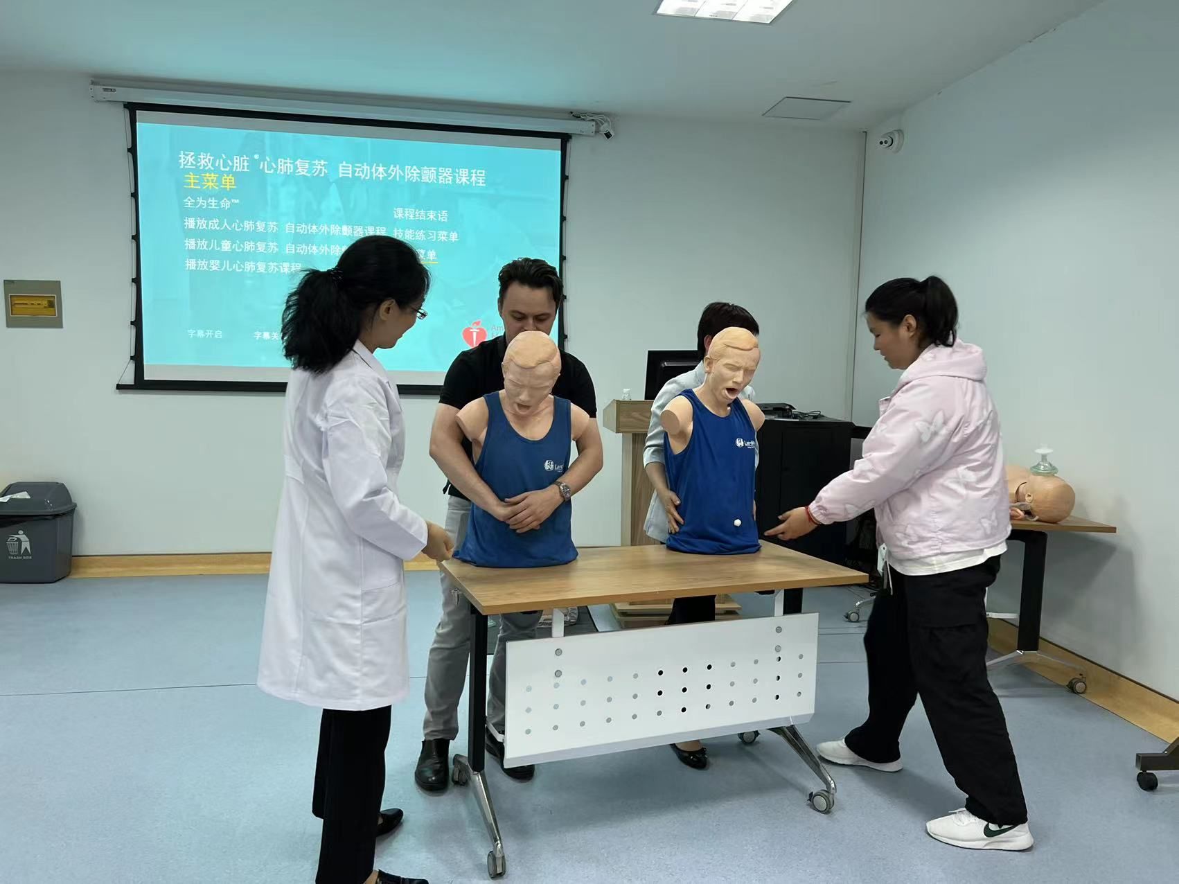 此次培训分为理论学习和操作练习两个环节,特邀请到医学院肖瑞和徐国梅两位授课老师利用多媒体课件、人体模型、现场实操等形式,向中心师生重点讲解了心肺复苏和海姆立克急救手法等应急救护知识技能。在理论学习环节中,二位老师用生动的语言、真实的案例,围绕突发事件,结合日常生活和工作,利用人体模型结合视频细致讲解了如何判断是否需要对病人进行心肺复苏及操作流程、方法、注意事项和停止操作的条件,并向大家演示了心肺复苏的实用操作技能,让中心师生在指导下进行实际操作,以便更好地熟悉和掌握相关应急救护技能。