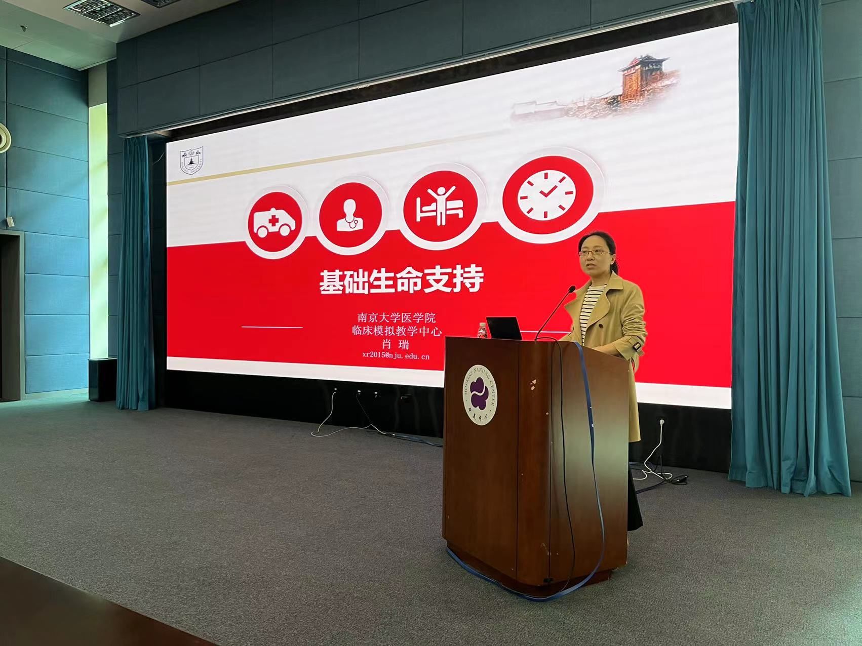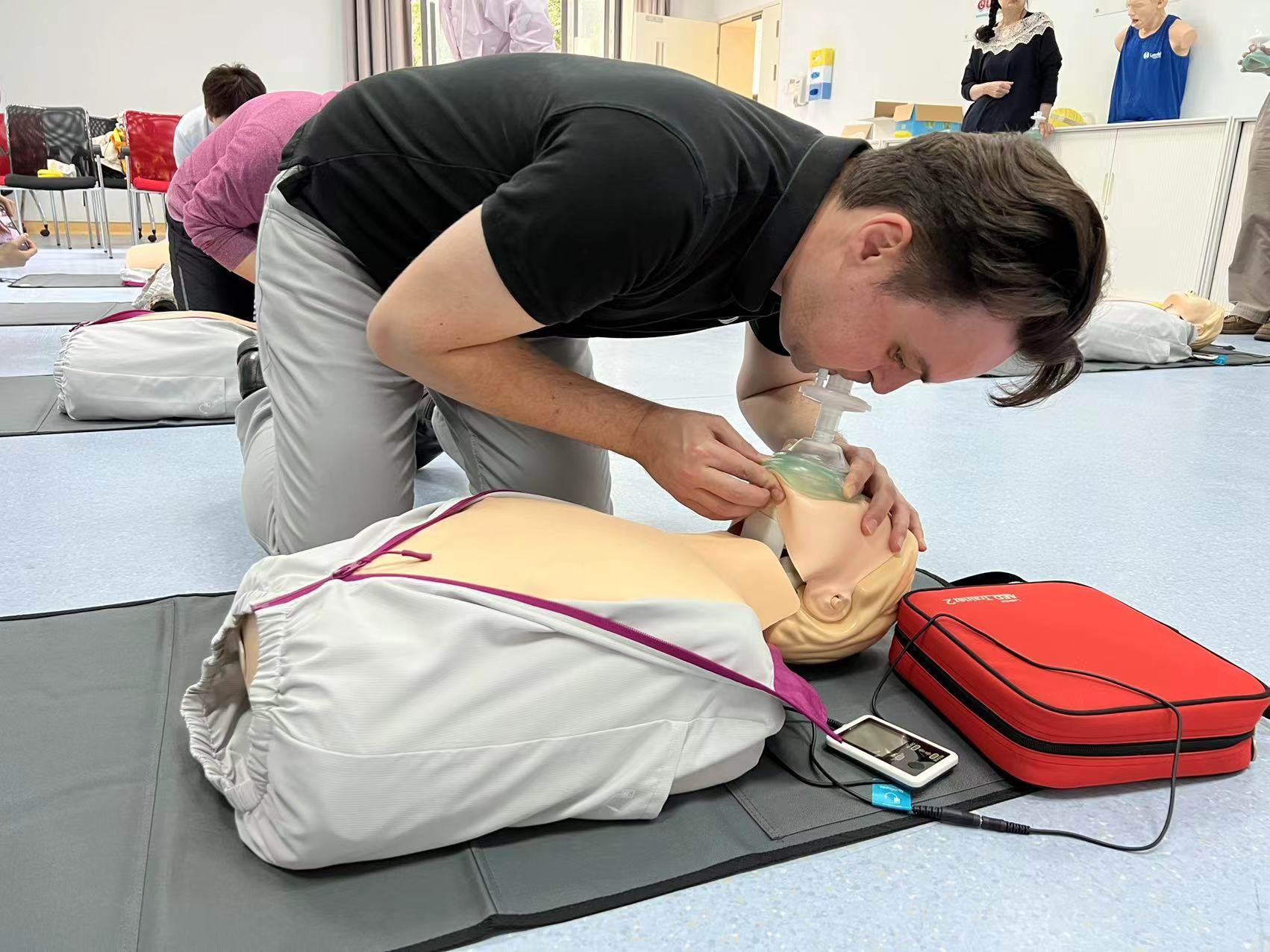 比如,考虑到心脏骤停的最佳抢救时间虽短,但却有"黄金4分钟"与生命赛跑的机会。活动中,肖瑞和徐国梅两位老师为在场的中心师生们详细讲解如何正确使用AED设备,以及为病人争取黄金救援时间的必要性和有效方法。